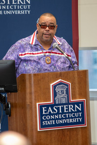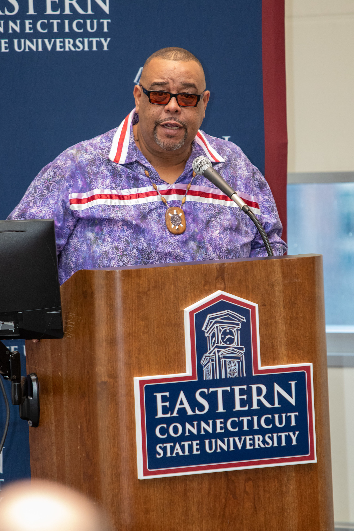 Michael Thomas, cultural resources director of the Mashantucket Pequot Tribal Nation, spoke of Native people's ongoing battle for recognition in the United States.